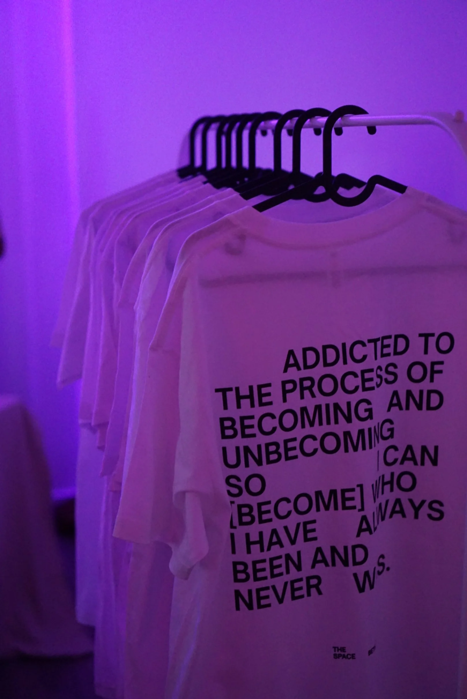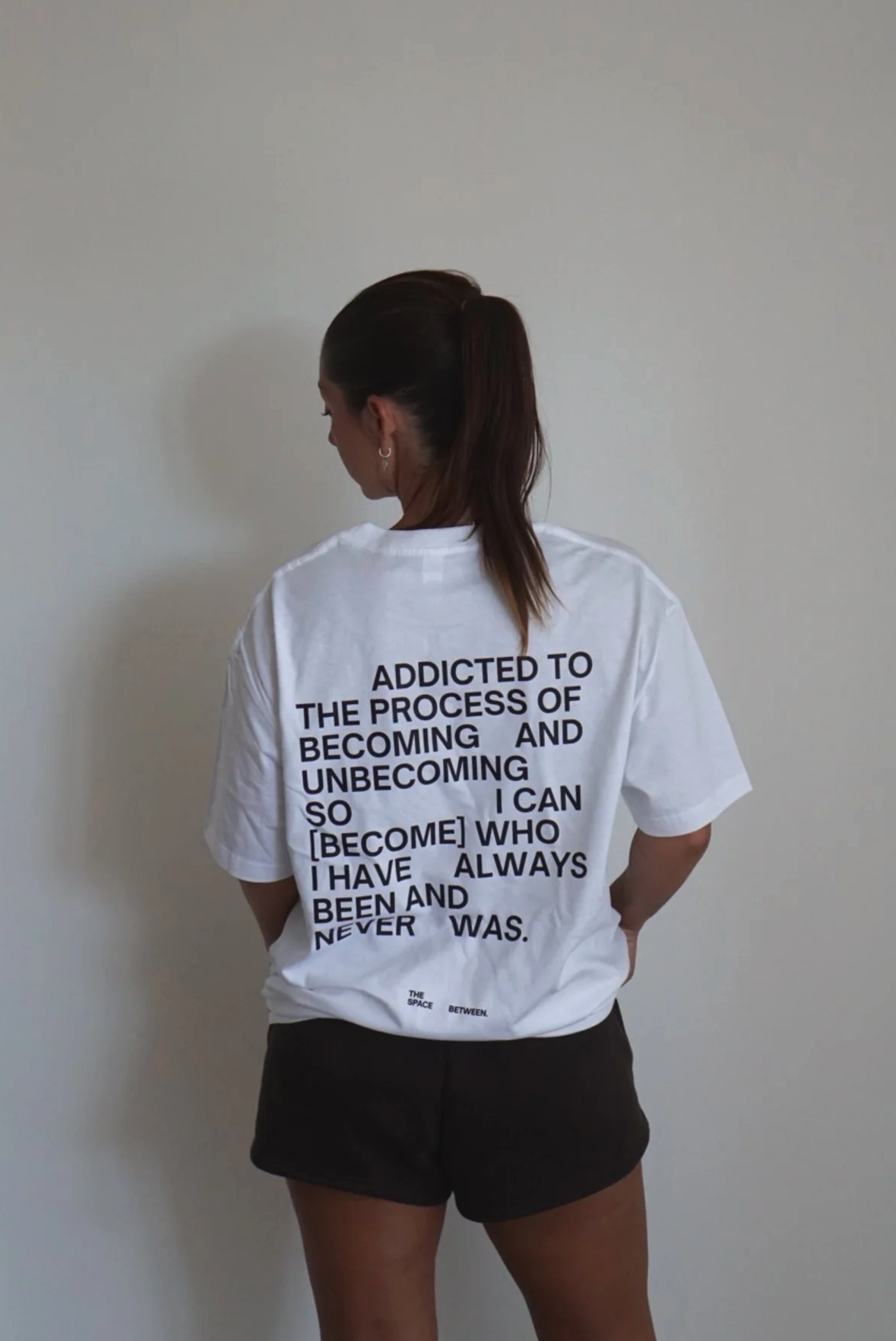 Features signature [becoming] quote on back and small The Space Between logo on front.